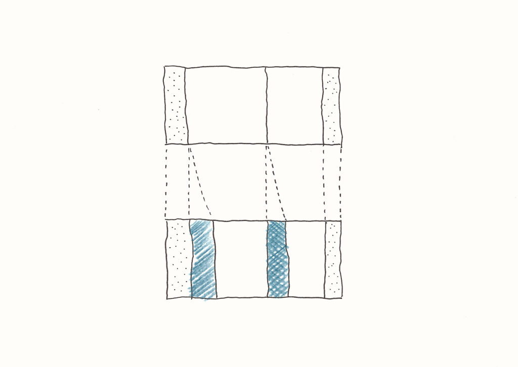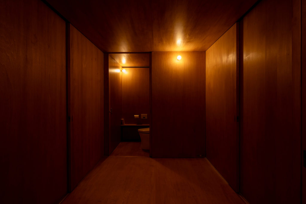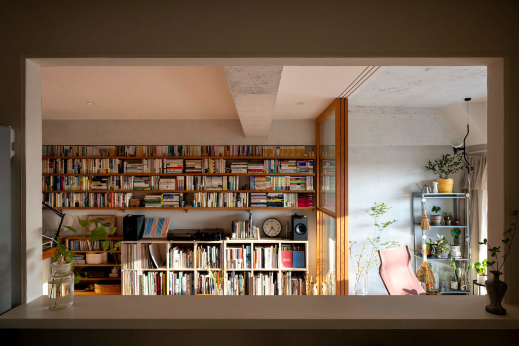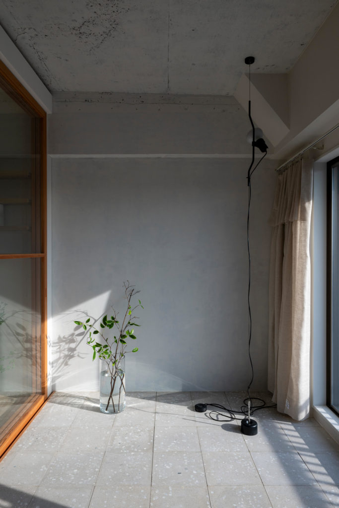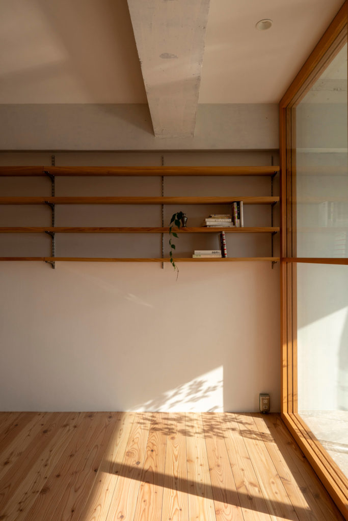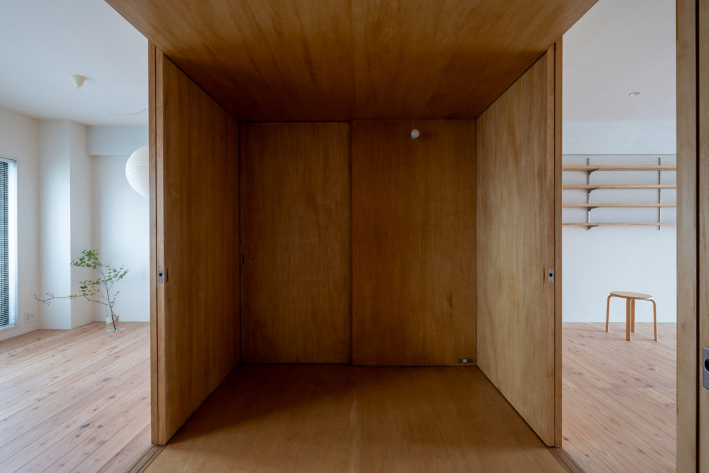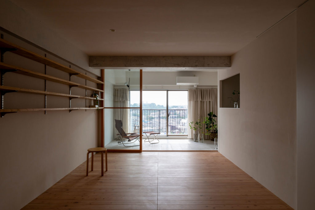 既存の1LDKから間取りは基本的に変えず、納戸の壁を解体し、トイレの向きを90度回転させる程度の変更に留めている。10年ほど前に一度改修されており、設備も比較的新しかったため、照明器具以外はほとんどそのまま使用している。居室は既存仕上の上から無垢フローリングと漆喰仕上を施した。ささやかな介入としては、室と室、あるいは、室と外部との境を新たに大きな建具で設え直したことで、それらの間に帯状の領域ができあがったことである。そうしてつくられた領域には、特に用途らしい用途は与えない。代わりに、居室のニュートラルな仕上とは対照的に、ざらりとした質感をもった仕上を施した。リビングと寝室との間には、ベニヤで覆われた艶のある廊下、のようなものが、リビングとベランダとの間には、研ぎ出し平板が敷き詰められた剥き出しの土間、のようなものが、それぞれ生まれた。強いていえば、前者はプライベートな空間を隔てる緩衝帯で、後者は強い西日を和らげる減衰帯、である。玄関からつながる外部との社会的なバッファーと、ベランダからつながる外部との環境的なバッファー、という言い方もできるかもしれない。いずれも動線としては間延びしているし、部屋としては少々心許ない。しかしそこには、未分化な素地の状態ゆえの、モラトリアムな生活の予感がある。そうした、何か役割を担わされる以前の、可能性が開かれた状態に興味がある。nLDKの機能的な間取りの中に、まだ何ものでもない、生活の素地をそっと挿し込んだ。